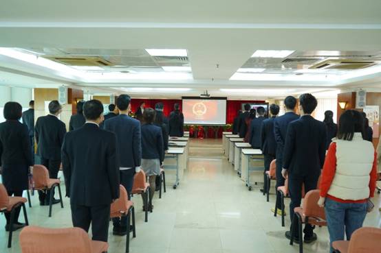 公司升國旗儀式現場,全體參會員工起立奏唱國歌