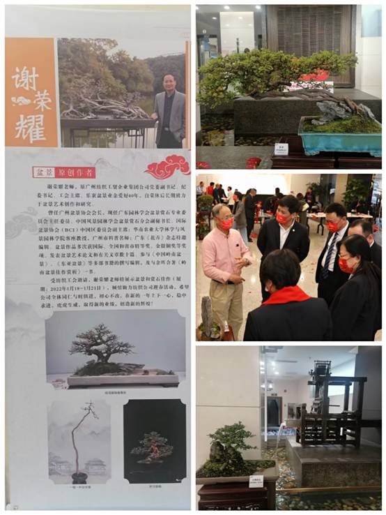 盆景是以植物和山石為基本材料在盆內(nèi)表現(xiàn)自然景觀的藝術(shù)品。為激勵廣大員工“穩(wěn)中求進”穩(wěn)健邁步“十四五”,原廣州紡織工貿(mào)企業(yè)集團公司黨委副書記、紀委書記、工會主席謝榮耀老師(現(xiàn)任廣東園林學會盆景賞石專業(yè)委員會主任委員)受邀公益展示了原創(chuàng)的《不忘初心》、《根深基穩(wěn)一往無前》、“咬定青山”等10個盆景靈石佳作,一枝一葉,一盆一景,妙趣橫生,寓意深刻,勵志鼓舞,吸引廣大員工駐足鑒賞。