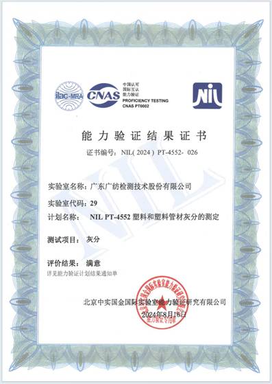 喜報:廣紡檢測公司收到塑料灰分測定能力驗證結果滿意證書