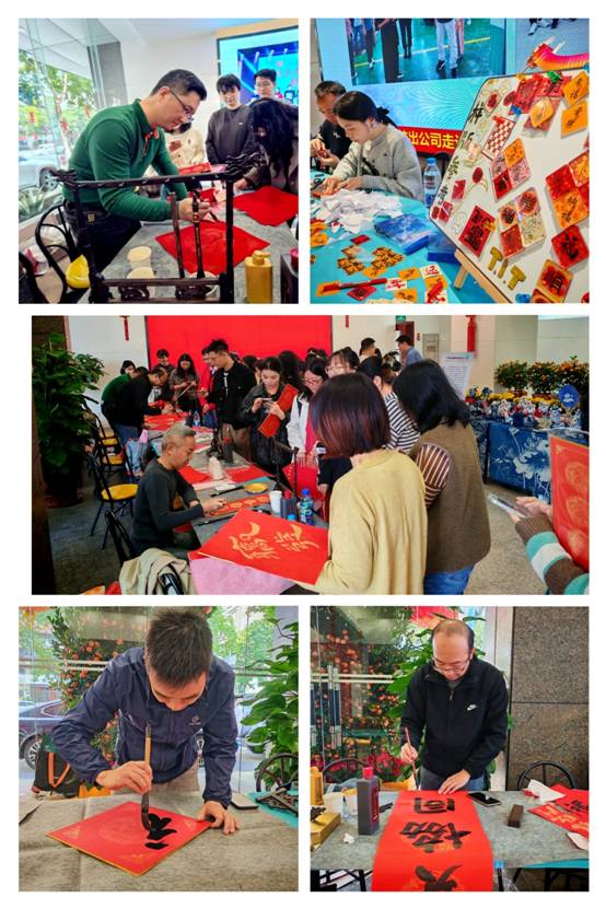 吉祥福手送祝福。在廣德一樓大堂,公司4位書法愛好者張漢彬、李運峰、吳宏景、禤俊峰應(yīng)邀揮墨送福;設(shè)計師黃雨桐巧妙手工制作福字冰箱貼,大堂喜氣洋洋,年味十足,上百名員工參加現(xiàn)場接福活動。福手們凝神靜氣,手腕妙轉(zhuǎn),在一張張紅紙上揮灑自如地書寫“?!弊趾透魇郊榇郝?lián),一個個蒼勁有力或流暢飄逸或趣味可愛的“?!眰鬟f到接福的同事們手上,大家眉開眼笑,幸福綻放。這一傳統(tǒng)習俗承載公司對廣大員工的新年美好祈愿與祝福,場景溫馨而充滿喜悅?;顒蝇F(xiàn)場共送出500多份福字作品。