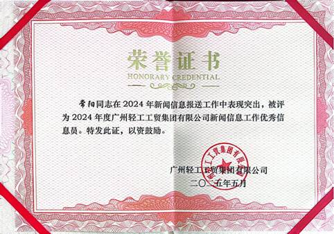 5月8日,廣州輕工集團2025年新聞信息工作會議對2024年度新聞信息工作先進單位和先進個人進行了表彰。紡織公司榮獲“2024年度廣州輕工工貿(mào)集團有限公司新聞信息工作先進單位”稱號,唐雪萍、常陽被評為“2024年度廣州輕工工貿(mào)集團有限公司新聞信息工作優(yōu)秀信息員”。